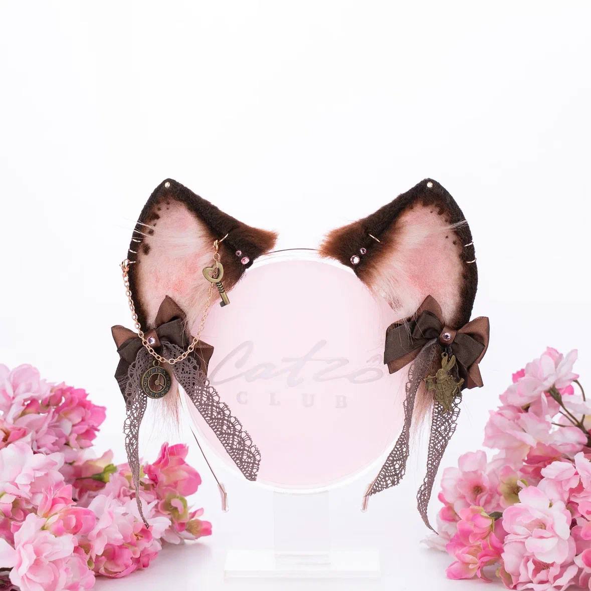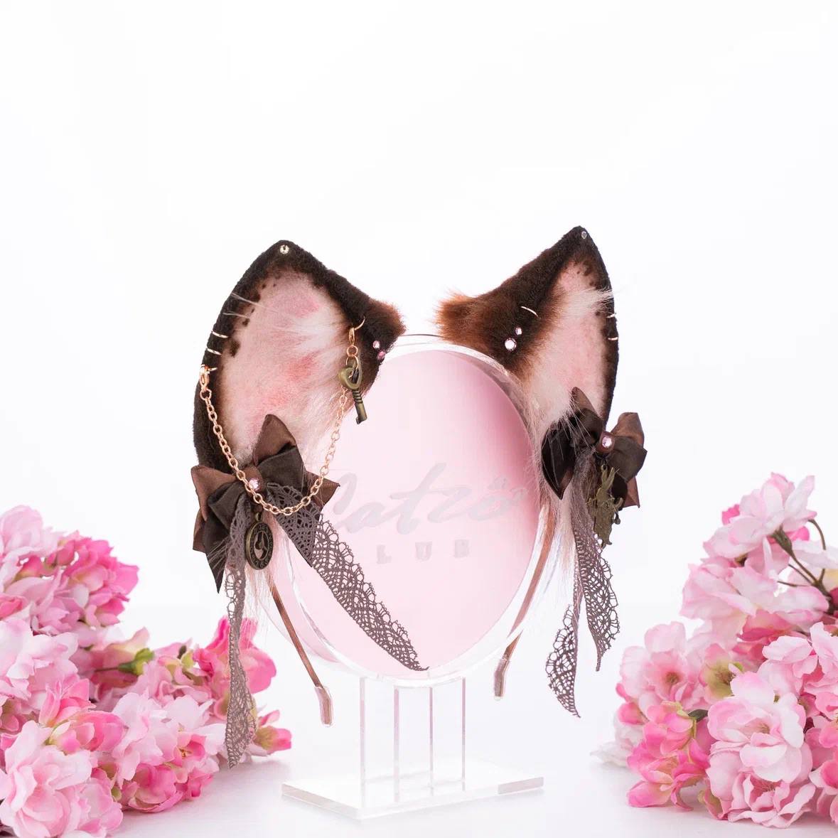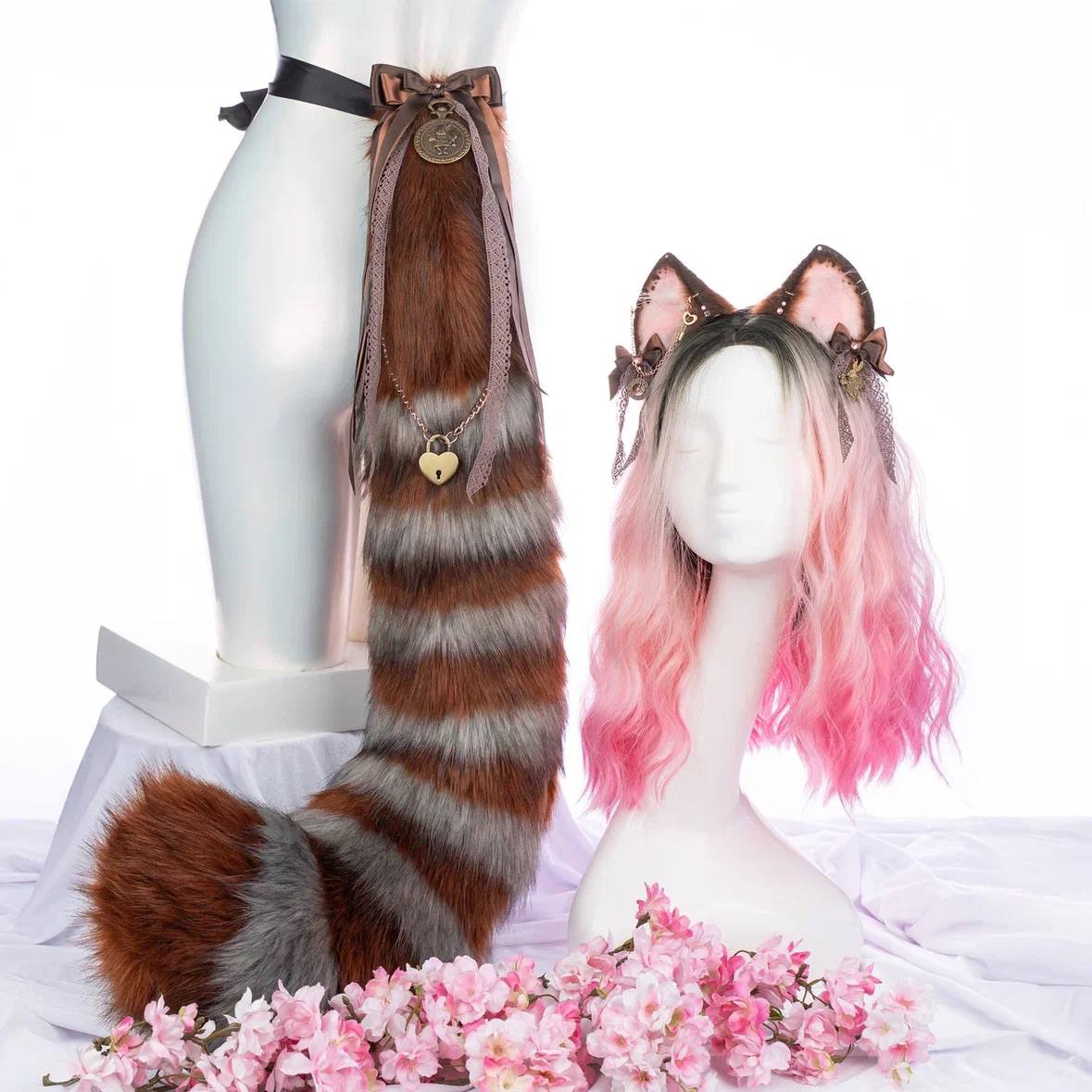 Black and orange kitten tail is approximately 35 inches long and made of top quality faux fur. Decorated with removable bat winged bow with a Catzo pumpkin enamel pendant. The tail is attaching by an elastic belt loop with a wide double-sided ribbon to go on the waist. Has a lobster clasp for attaching to clothes.
