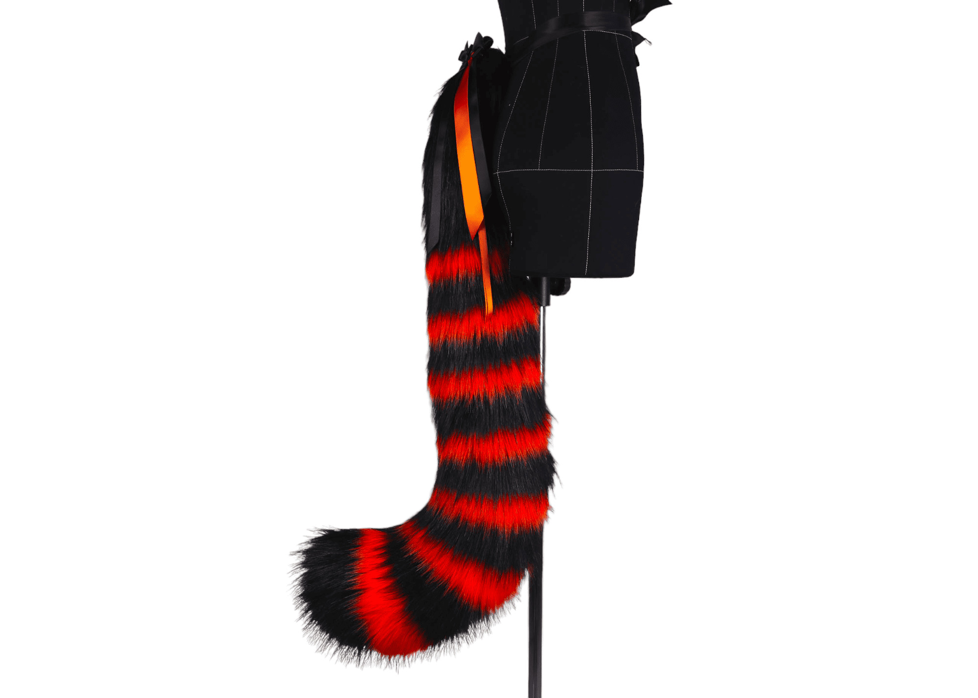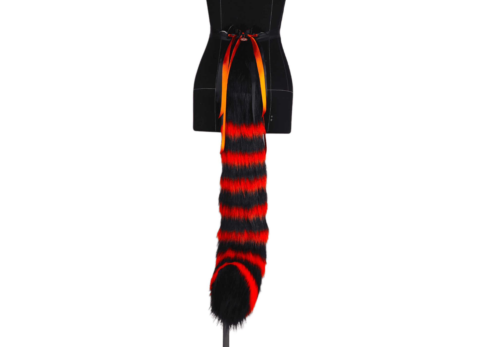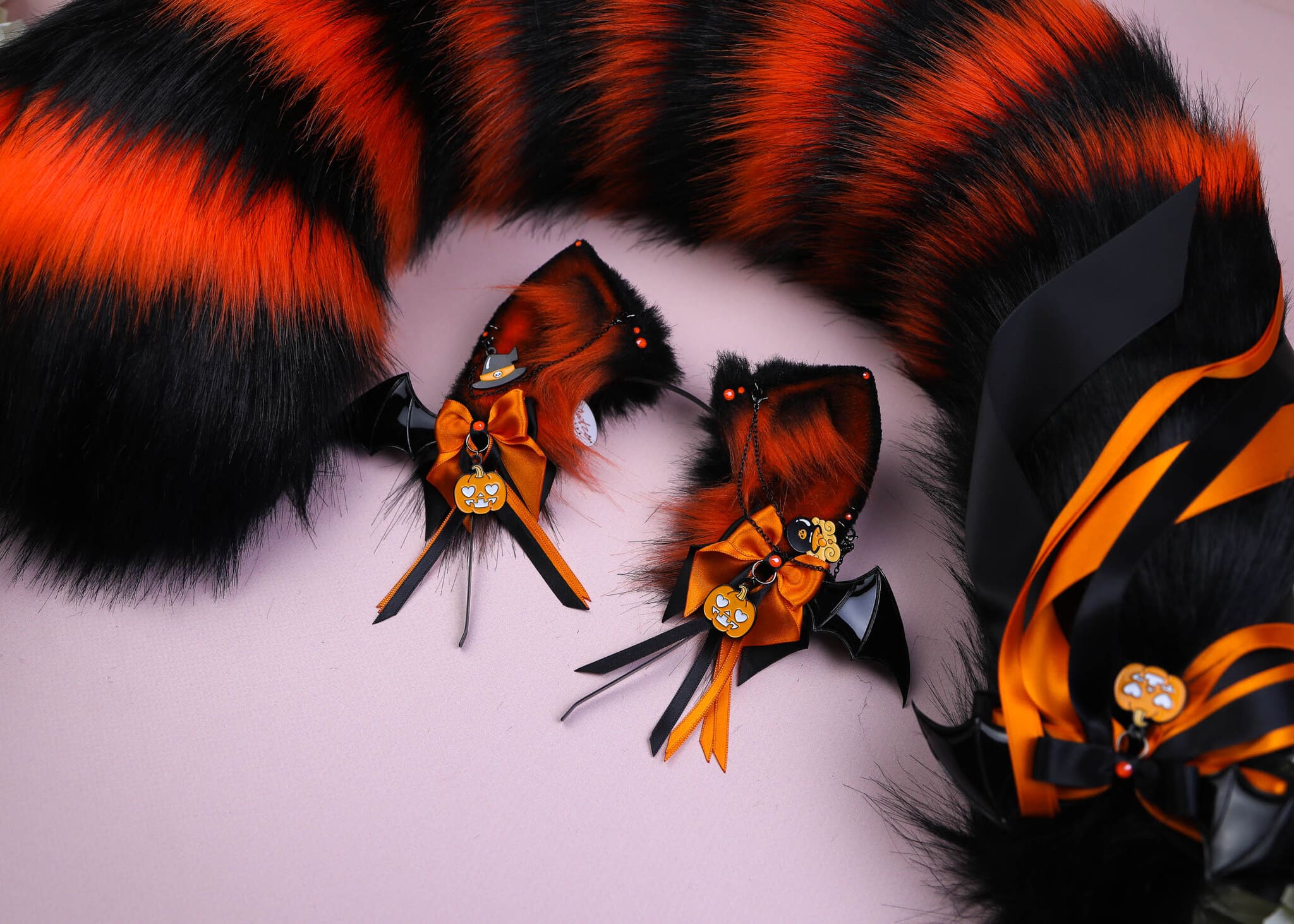 Black and orange kitten tail is approximately 35 inches long and made of top quality faux fur. Decorated with removable bat winged bow with a Catzo pumpkin enamel pendant. The tail is attaching by an elastic belt loop with a wide double-sided ribbon to go on the waist. Has a lobster clasp for attaching to clothes.