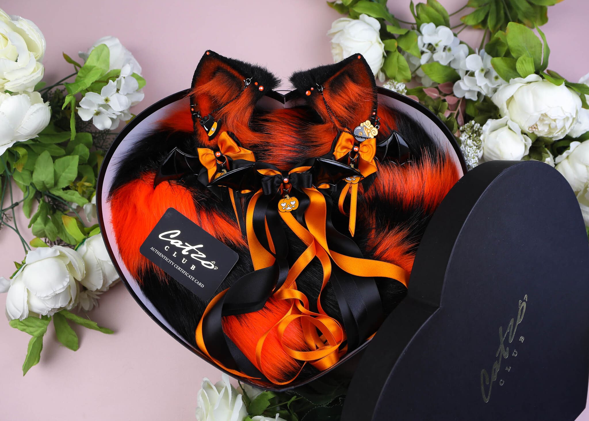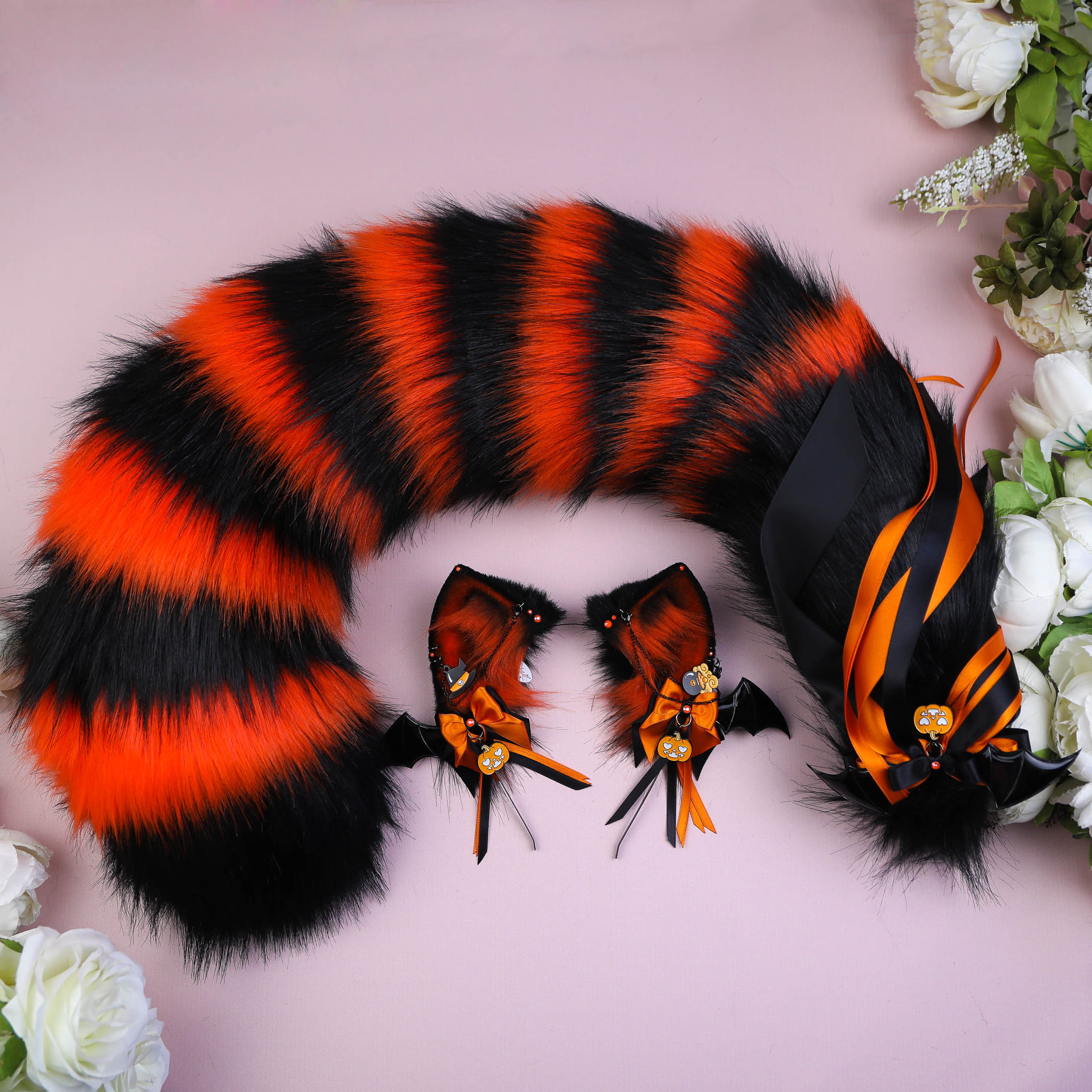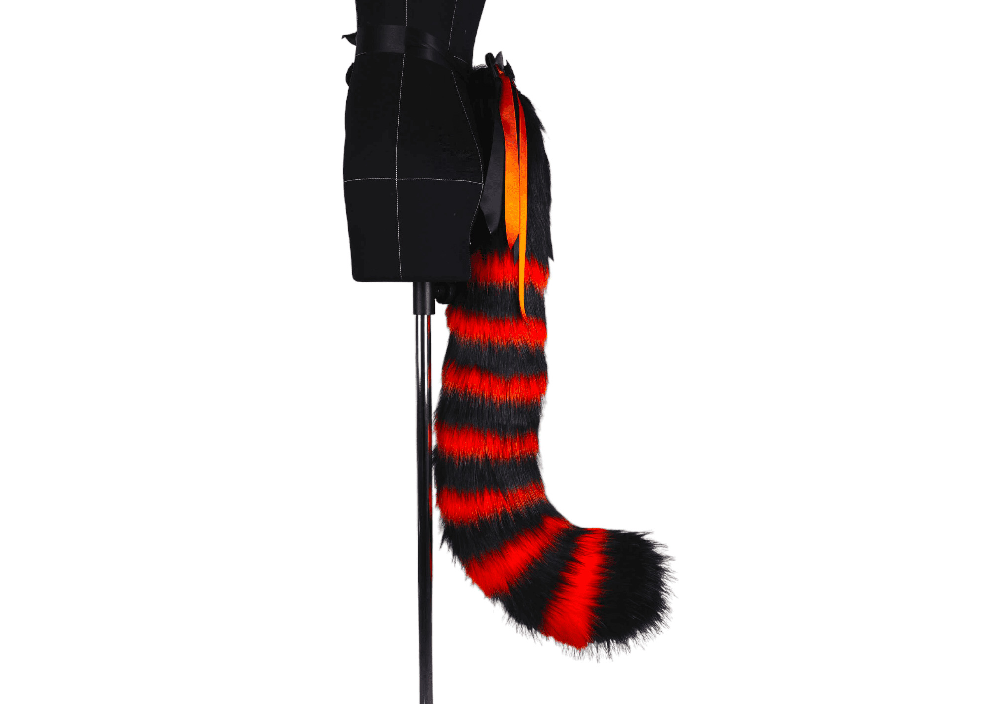 Black and orange kitten tail is approximately 35 inches long and made of top quality faux fur. Decorated with removable bat winged bow with a Catzo pumpkin enamel pendant. The tail is attaching by an elastic belt loop with a wide double-sided ribbon to go on the waist. Has a lobster clasp for attaching to clothes.