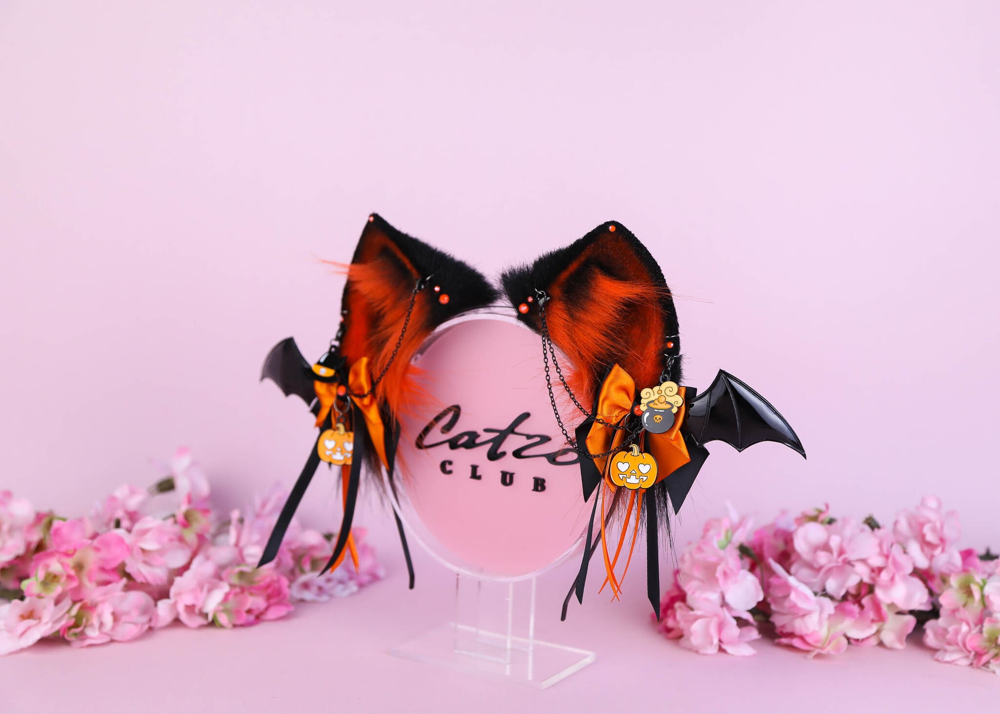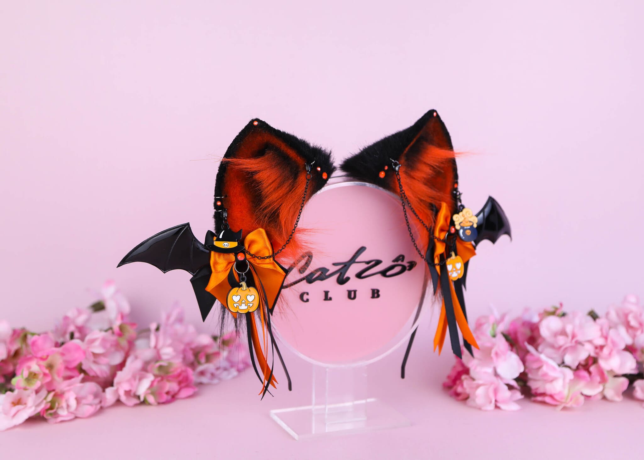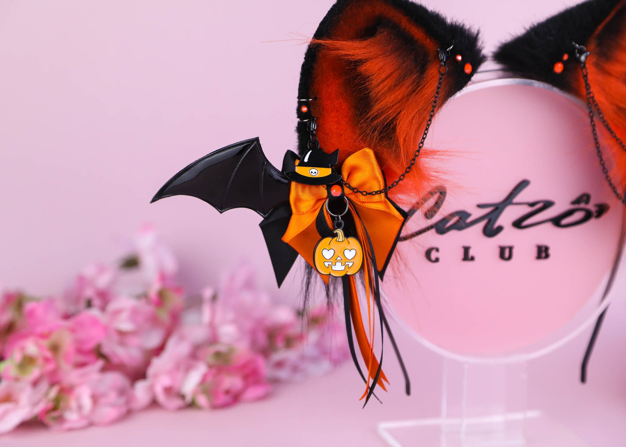 Black and orange kitten ears, approximately 2,25 inches tall are made of luxury faux fur, crystallized with Swarovski and decorated with metal hoops, chains, a themed pendant, bat winged removable bows with Catzo pumpkin enamel pendants. Ears are fully wired and posable on the metal headband