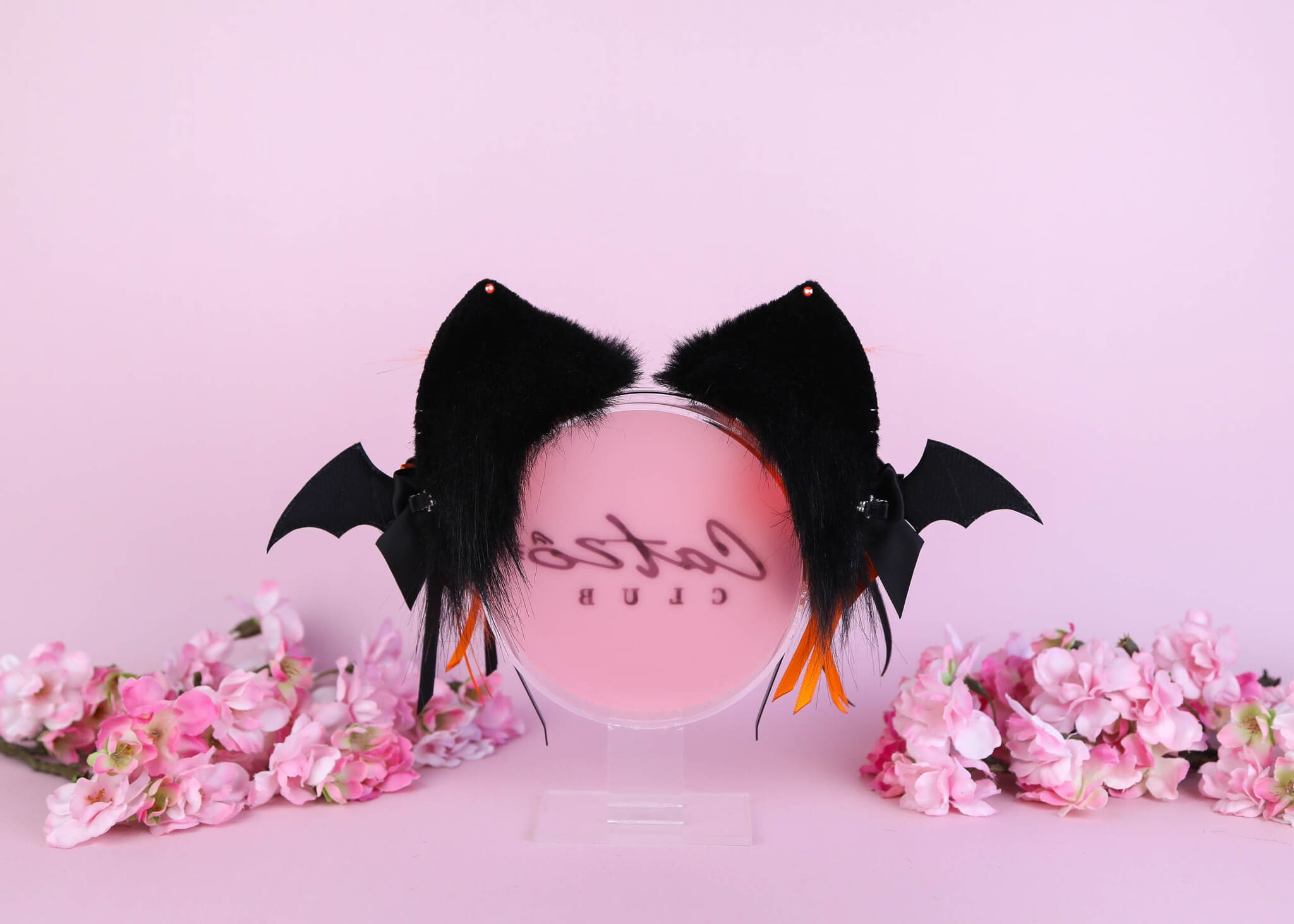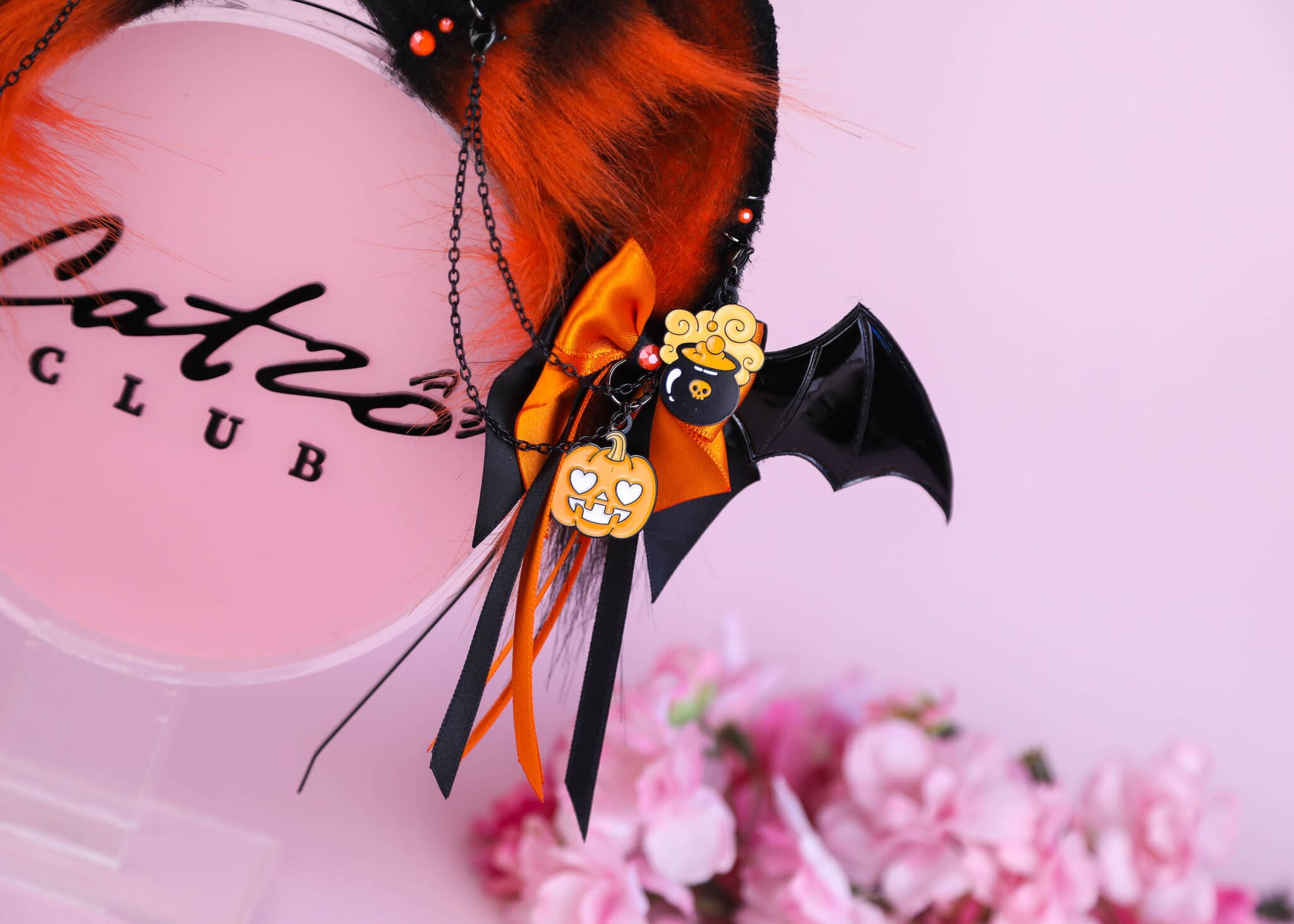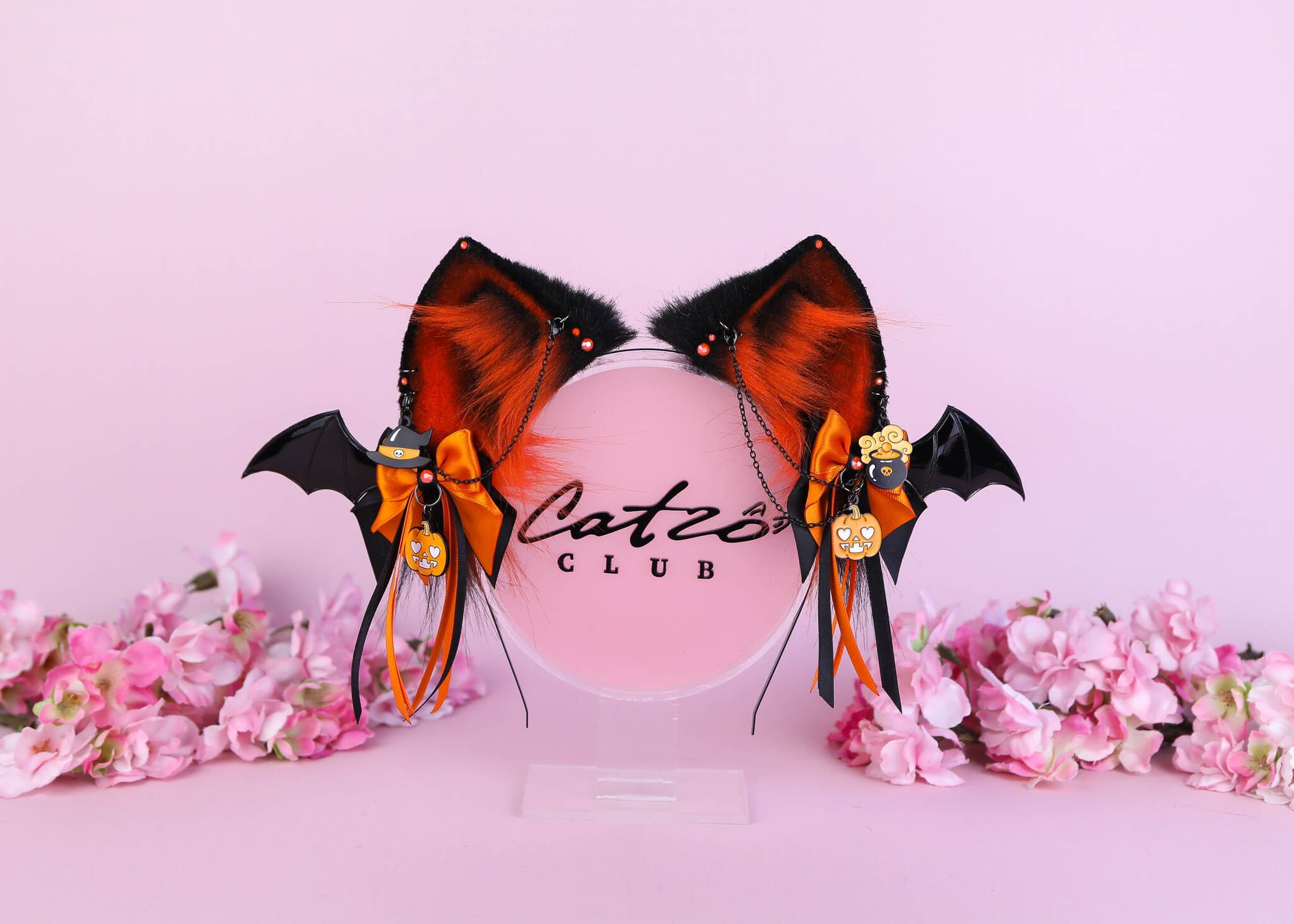 Black and orange kitten ears, approximately 2,25 inches tall are made of luxury faux fur, crystallized with Swarovski and decorated with metal hoops, chains, a themed pendant, bat winged removable bows with Catzo pumpkin enamel pendants. Ears are fully wired and posable on the metal headband