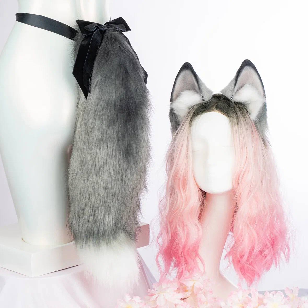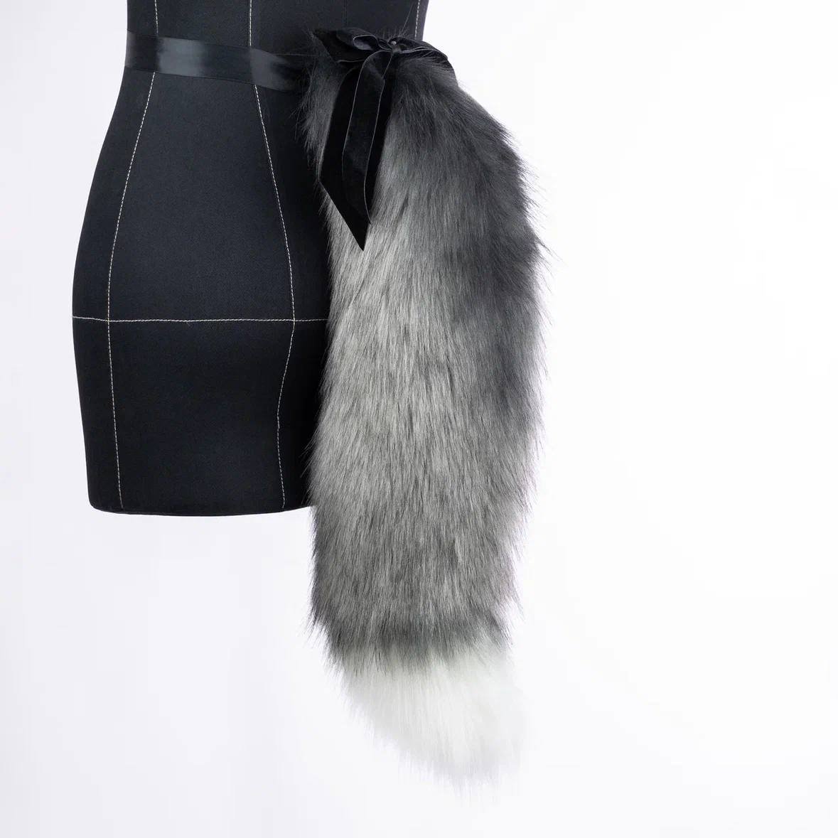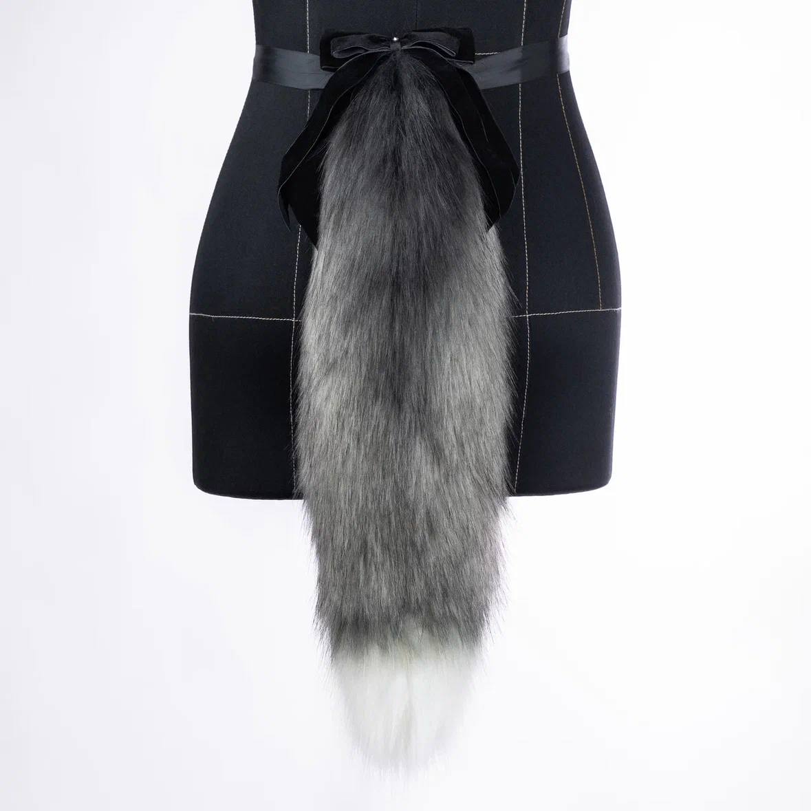 Grey fox tail is approximately 22 inches long and made of top quality faux fur. Decorated with a removable bow and black bell. The tail is attaching by an elastic belt loop with a wide double-sided ribbon to go on the waist. Has a lobster clasp for attaching to clothes.
